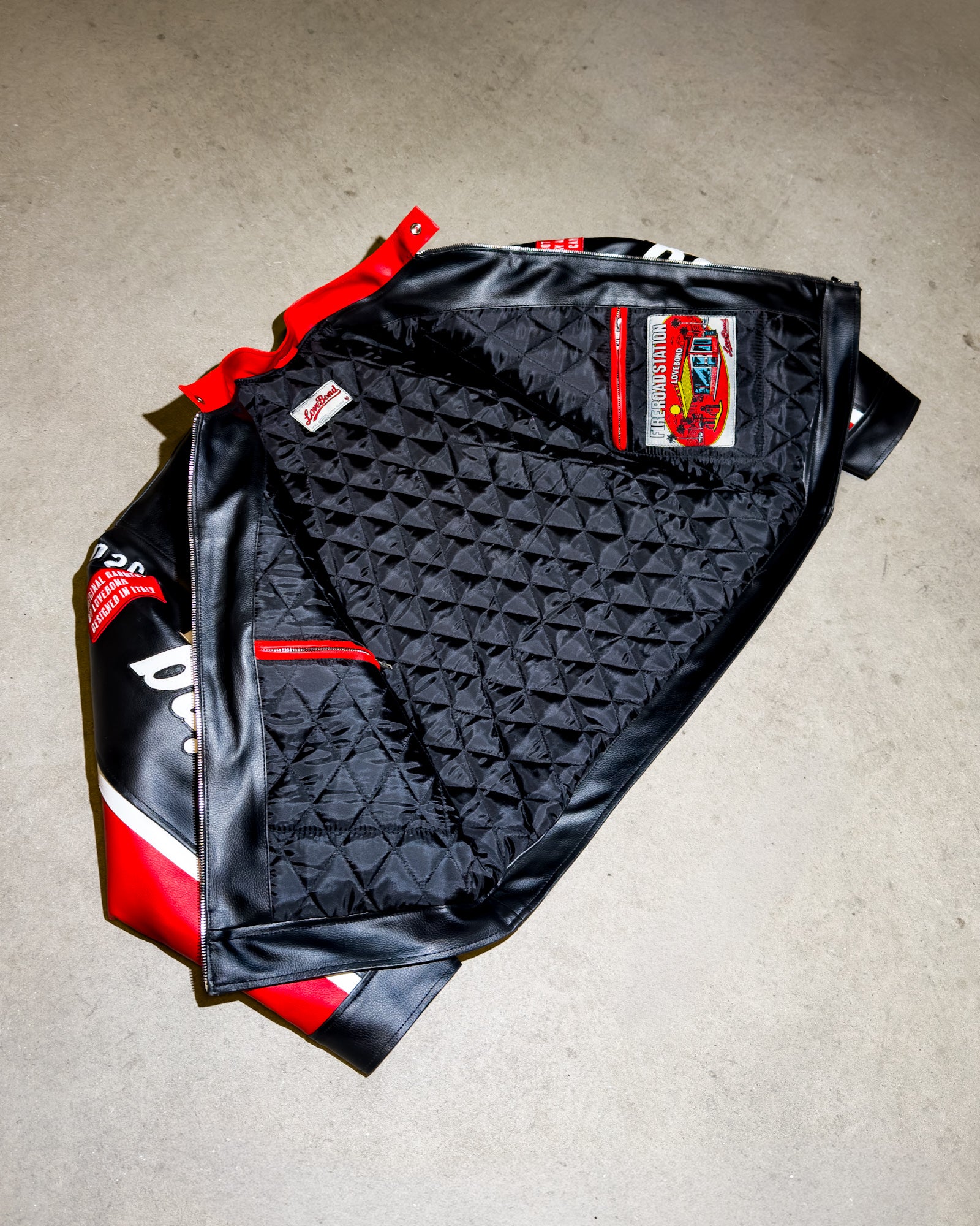 La "Fire Road" Racing Jacket combina stile e comfort in un design elaborato, arricchito da dettagli di colore rosso.